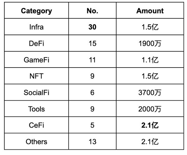 In December 2023, a total of 98 financing events were counted, 78 more than last month. Among them, the infrastructure track had the largest number of financings: 30; the track with the highest total financing amount was CeFi, with 210 million.