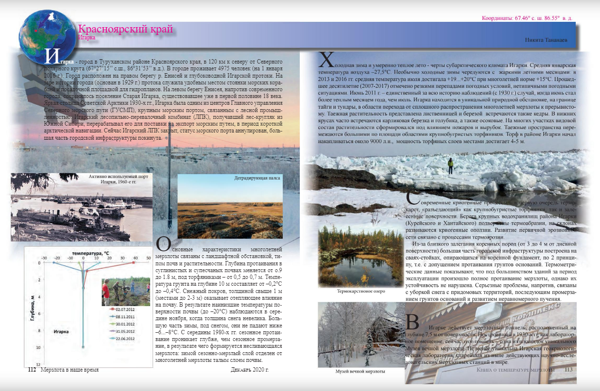 Норильск - самый крупный город, расположенный в зоне вечной мерзлоты: его население 178800 человек. Город характеризуется относительно высокой плотностью населения, большой концентрацией горнодобывающих и горно-обогатительных комбинатов вокруг, а также развитой инфраструктурой различных видов. Климат Норильска суровый. зима здесь длинная и холодная, а лето короткое, но относительно теплое. Среднегодовая температура воздуха за 1980-2010 гг. составила - 8.5°С. годовое количество осадков 465 мм (в основном в виде снега). Среднеянварская температура -26.8°С, среднеиюльская +14.2°С. За 1970-2000 гг. среднегодовая температура воздуха выросла на 1,4°С. а осадки - на 10 мм. Температура вечной мерзлоты в пределах города варьирует от -6 до -7°С...