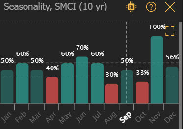 Ещё один риск — сезонность: если посмотреть на исторические тенденции торговли, октябрь, как правило, слабый месяц с относительно низкой «долей выигрышных сделок». В отличие от этого, ноябрь, кажется, гораздо сильнее — доля выигрышных сделок составляет 100%. Хотя это не гарантирует будущих результатов, это говорит о том, что инвесторам следует рассмотреть возможность усреднения долларовой стоимости, например, покупая акции поэтапно в конце сентября и октябре, чтобы избежать влияния краткосрочной волатильности.