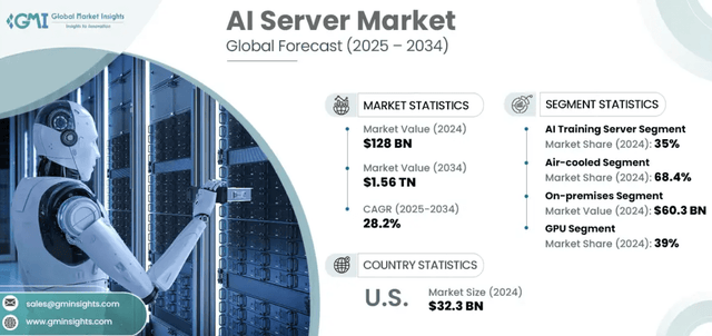 Все эти стратегические разработки вселяют большой оптимизм, поскольку происходят на фоне бурного роста отрасли. Согласно комплексному отчёту Global Market Insights, объём мирового рынка серверов ИИ в 2024 году составил колоссальные 128 миллиардов долларов, а к концу 2025 года он вырастет до ещё больших 167,2 миллиарда долларов, а к 2034 году — до 1,56 триллиона долларов, что соответствует среднегодовому темпу роста 28,2%.