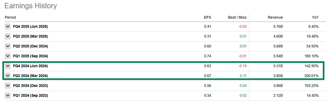 Более того, рост выручки в годовом исчислении в четвертом квартале остался стабильным, увеличившись на 8,5%. Это заметное замедление по сравнению с предыдущими кварталами, но оно выглядит абсолютно естественным, поскольку сравнительные показатели значительно выше. Более того, мы можем видеть [ниже], что четвертый квартал 2024 года стал именно тем кварталом, когда квартальные продажи SMCI резко выросли с менее чем 4 миллиардов долларов сразу до более чем 5 миллиардов долларов. Поэтому неудивительно, что рост выручки в четвертом квартале 2025 года был намного медленнее роста выручки в третьем квартале 2025 года.