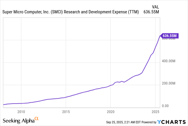 Расширение географии присутствия — лишь часть стратегии роста SMCI. Ключевым элементом, конечно же, являются агрессивные инновации. Это видно по стремительно растущему бюджету компании на НИОКР, который жизненно важен для успеха, поскольку эта ниша весьма конкурентна с такими крупными игроками, как Dell Technologies и Hewlett Packard Enterprise. Поэтому агрессивный темп инноваций жизненно важен, и SMCI в этом отношении весьма успешно справляется.