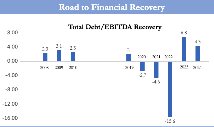 Во время кризиса 2008 года акции CCL рухнули на 70%, несмотря на сильный потребительский спрос с заполняемостью более 100% и положительной EBITDA в размере 3,5 млрд долларов. В настоящее время CCL снова демонстрирует рекордно высокие заполняемости и расширяет свой флот, одновременно повышая цены. Теперь, когда соотношение долга/EBITDA CCL демонстрирует уверенное восстановление до 2,5x, как и в 2008 году, я ожидаю переоценки акций по мере закрытия этого разрыва.