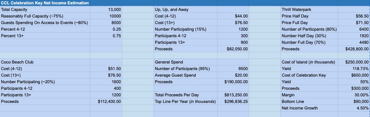 Ниже подсчитано, сколько RCL генерирует в год на своем острове за счет общих расходов, а также некоторые из предлагаемых ими мероприятий: Up, Up, and Away, Thrill Waterpark и Coco Beach Club.