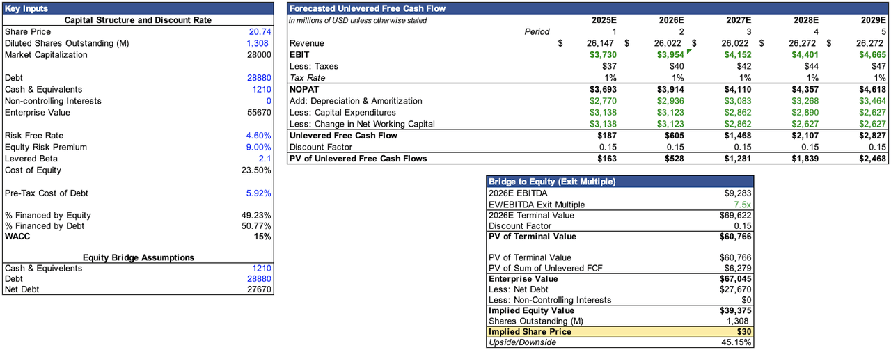 Ниже использовался подход Exit Multiples для оценки Carnival, дисконтируя его историческое отношение EV/EBITDA от 9x до 7,5x, поскольку это была попытка предоставить консервативную оценку. Было взято 4% CAGR для выручки и 4,6% CAGR для EBIT, поскольку ожидается увеличение маржи в условиях более высокого спроса (увеличение ценовой власти, суда LFG и расширение частных островов). Кроме того, сокращение процентных обязательств также будет способствовать расширению маржи. Также был рассчитан WACC в размере 15%, используя годовую бету 2,1, что привело к подразумеваемой цене акций в размере $29 - это представляет собой потенциал роста в 40%.