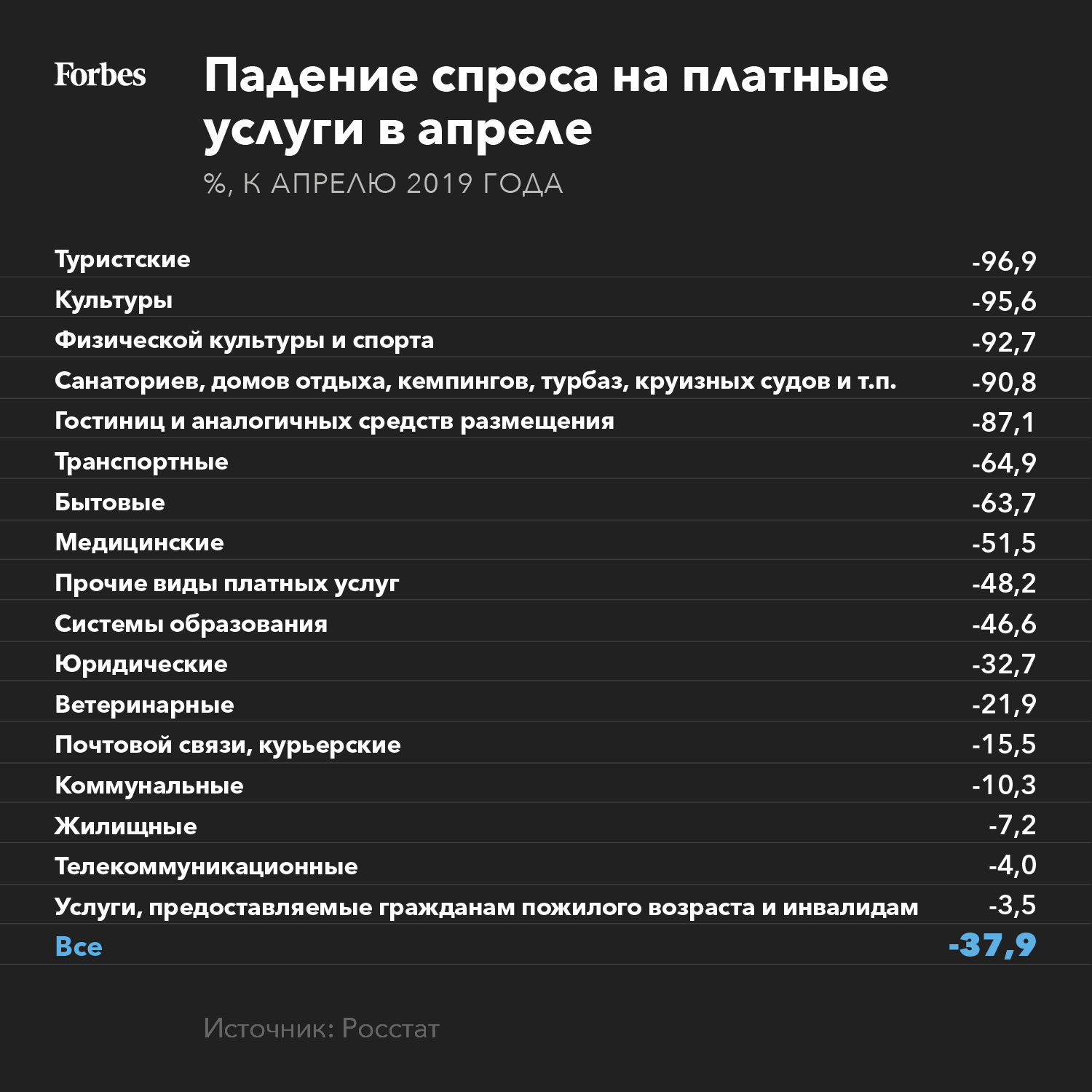 Период нерабочих дней, введенный в России в конце марта для предотвращения распространения коронавируса, нанес серьезный удар по всей экономике, но особенно сильный — по сфере услуг. В мае Росстат сообщил, что объем оплаченных россиянами услуг в апреле сократился более чем на треть в годовом выражении (до 537 млрд руб.). Теперь статистическая служба раскрыла данные о том, какие именно виды услуг пострадали этой весной.