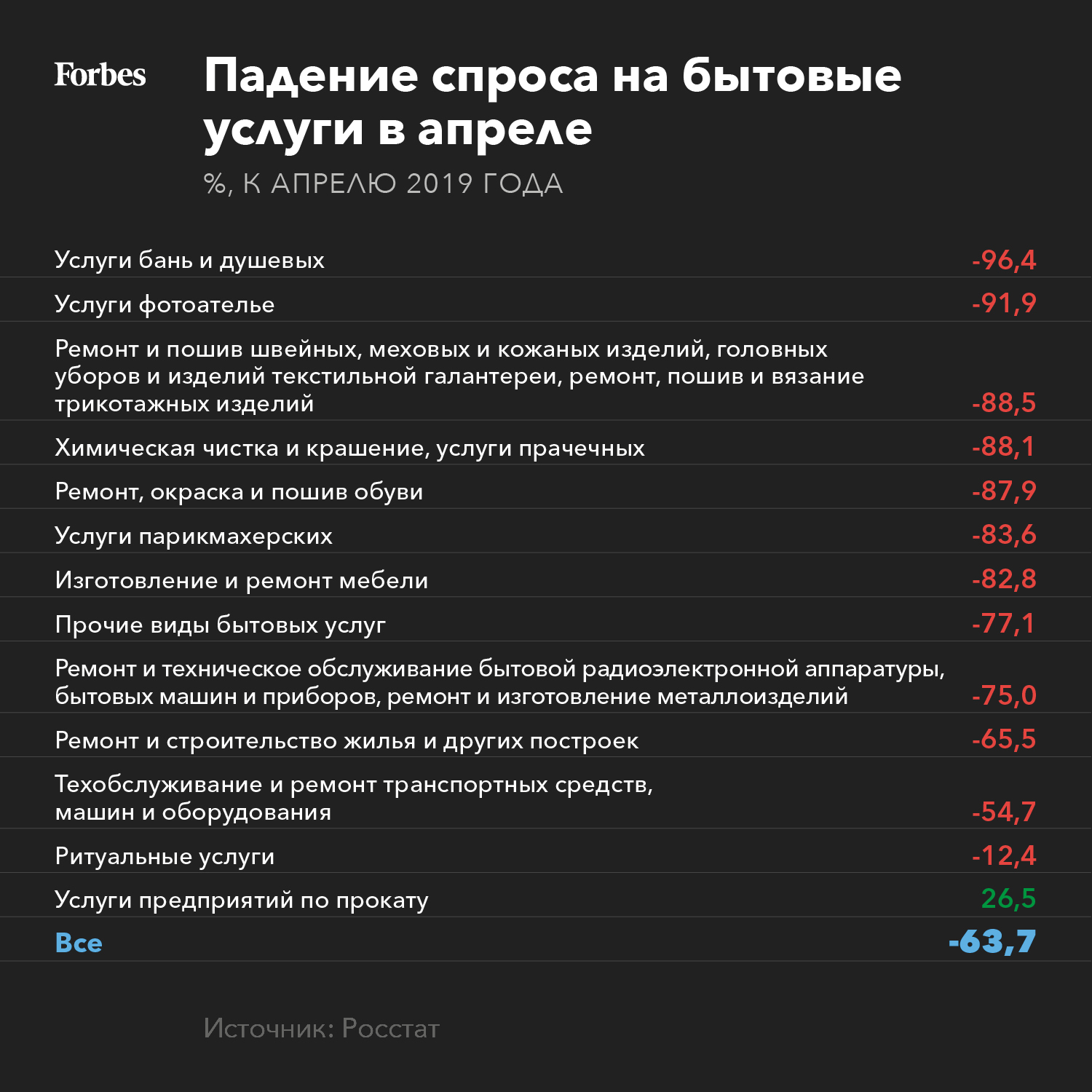 - Бытовые и транспортные услуги по всей стране просели более чем на 60%. При этом бани и фотоателье не получили и 10% выручки апреля 2019 года. Парикмахерские и салоны красоты, химчистки и прачечные, предприятия по ремонту и пошиву одежды и обуви, изготовлению и ремонту мебели сумели оказать менее 20% прошлогоднего объема услуг. Ритуальные услуги просели более чем на 12%.