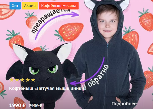 Сейчас под брендом «Кофтёныши» продаётся порядка 150 различных товаров. Основной продукт – игрушки-подушки, которые «превращаются» в кофты, футболки, дождевики. Они составляют всего 15-20% ассортимента, но приносят больше половины выручки. Остальная часть товаров – костюмы-комбинезоны (кигуруми), а также базовые и взрослые вещи.
