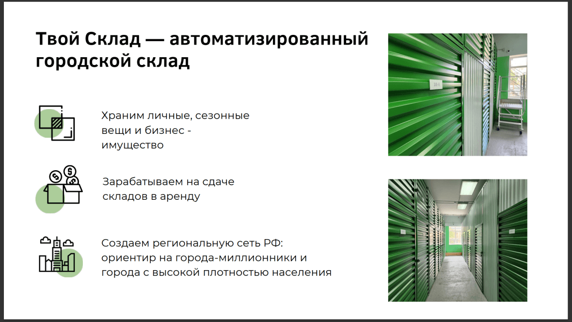 Твой Склад — сеть автоматизированных городских складов для хранения личных, сезонных вещей и бизнес имущества. Мы зарабатываем на сдаче складов/боксов в аренду размером от 1 до 30 кв. м. на срок от 1 месяца до года.