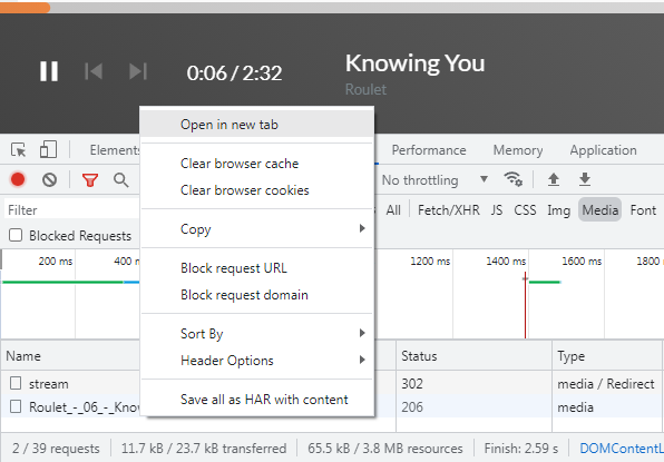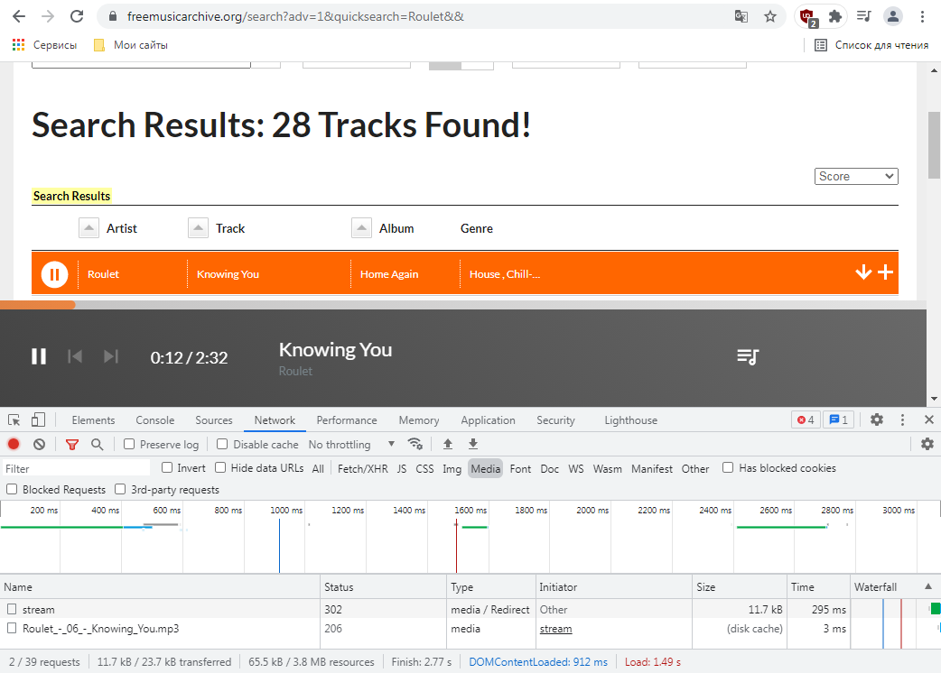 Обязательно после этого перезагрузите страницу клавишей F5, чтобы инструмент мог отслеживать полученные запросы сервера. Во встроенном плеере необходимо запустить наш аудиофайл с помощью кнопки Play. В этот момент необходимо отфильтровать запросы, выбрав пункт Медиа (Media), пример полученных медиаданных можно увидеть на изображении ниже.