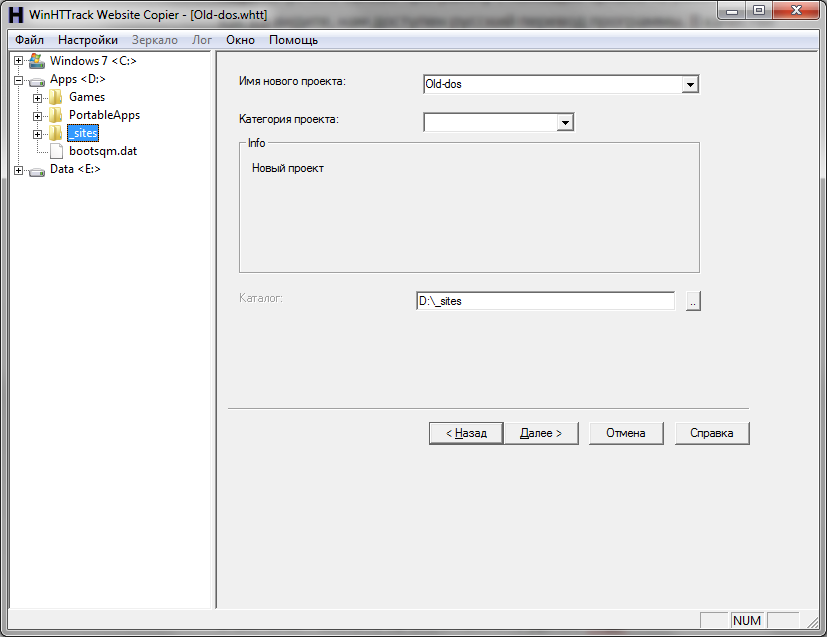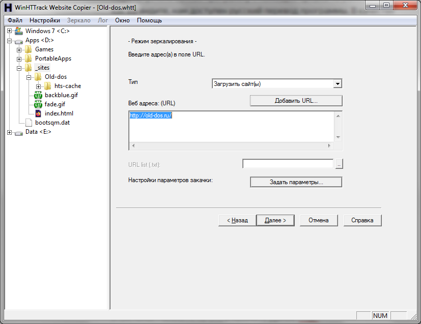 Перезапустите заново программу с помощью ярлыка на рабочем столе. Как вы видите, так нам стал доступен русский перевод программы. В качестве тестирования работы WinHTTrack предлагаю выбрать ресурс Old-DOS.ru - архив, хранящий список старых программ и операционных систем. Теперь можно поработать с мастером программы: в начале нажимаем на кнопку Далее.