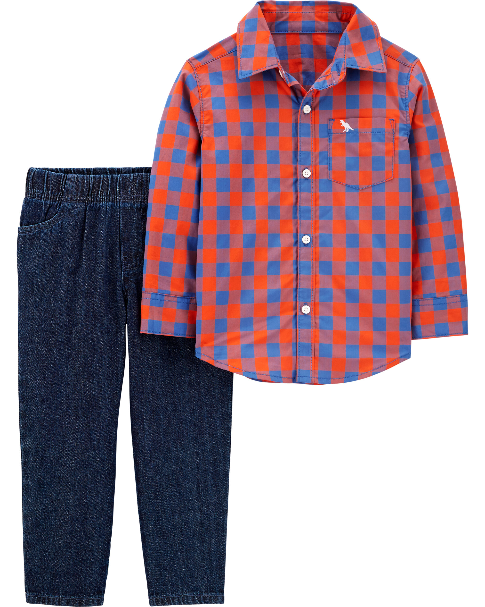 $10.00 фришип $35+ *DOORBUSTER* 2-Piece Plaid Button-Front Top & Twill Denim Pant Set