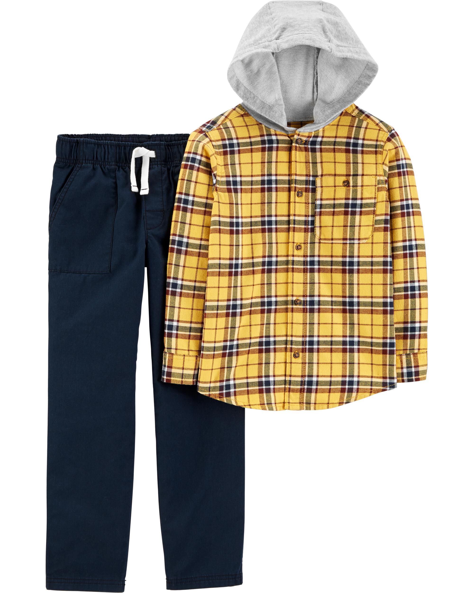 2-Piece Button-Front Flannel Hooded Top & Canvas Pant Set