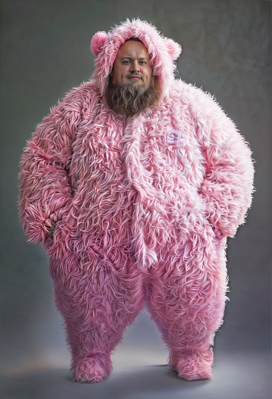 a photo of fat man with goatee beard wearing pink fuzzy and furry bear costume –cref https://i.postimg.cc/LsLqcF1L/IMG-2028.pn –cw 100