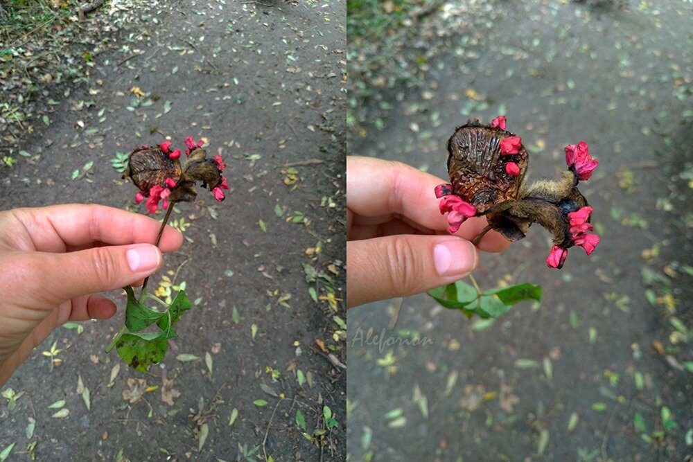 У этого “цветочка” на стебле росли листья дикого пиона, а вот венчик напоминал нечто инопланетное: раздвоенная высохшая до черна коробочка с двумя круглыми чёрными семенами. По периметру коробочки шёл ряд малиновых свежих “типа лепестков”, по форме напоминающих… даже не знаю, с чем их сравнить. Они были объёмными, замкнутыми, пустотелыми. Но они были свежие! Как свежие лепестки могли вырасти на засохшей одеревеневшей семенной коробочке, для меня осталось загадкой.