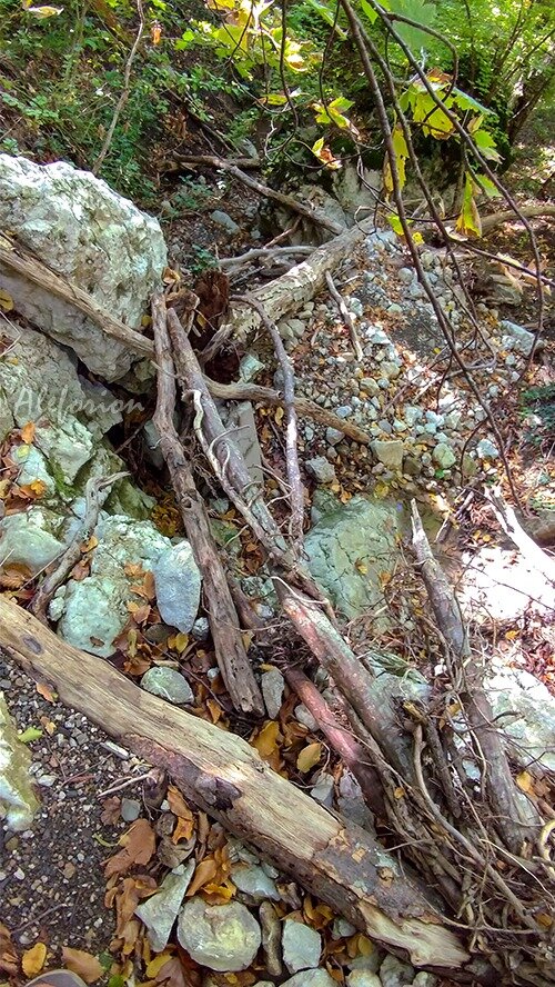 Ручей нанёс камни и брёвна на тропинку. Жёлтые листья похожи на слитки золота в лотке старателя.
