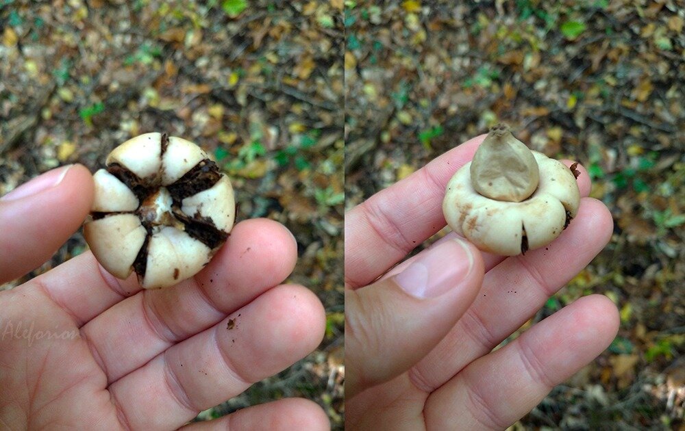 Грибы дождевики все знают – они белые, имеют шарообразную форму, однородные внутри и когда они стареют, то превращаются в шарик с тонкими стенками, наполненный изнутри сухими спорами. В какой-то момент шарик лопается, и у него из “макушки”, начинают вылетать споры.