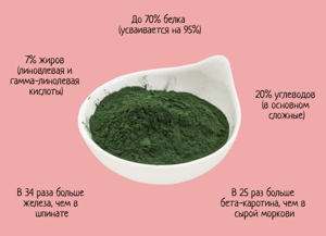 - Укрепляет иммунитет: благодаря высокому содержанию антиоксидантов и фикоцианина спирулина активирует защитные силы организма, повышает сопротивляемость вирусам и бактериям 25.