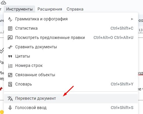 Инструменты → Перевести документ → Выбираешь язык → Google создаёт копию с переводом.