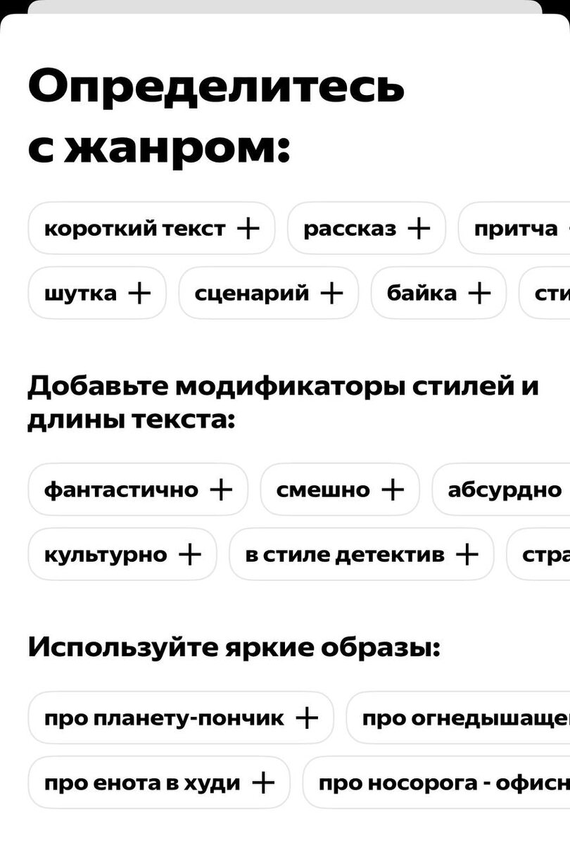 Шедеврум может создавать посты в соцсетях, описания товаров, статьи и даже рекламные тексты.