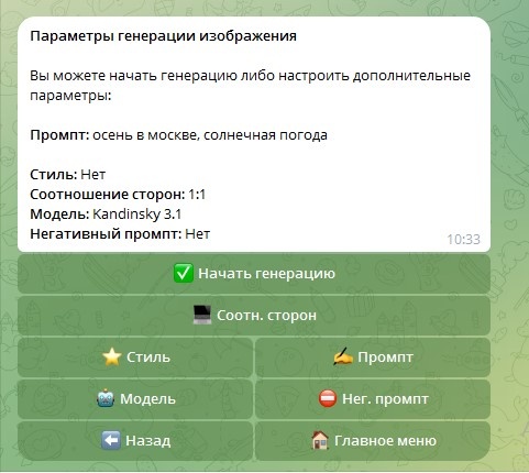 Есть один минус — в день доступна лишь одна бесплатная генерация, неважно, текст это или картинка, за остальное надо платить. Но цены разумные: 1 текстовый запрос — 1 р., 1 графический запрос — 2 р. Бот очень хороший. Если вам не нужно генерировать сотни картинок в день, то отлично подойдет для работы.