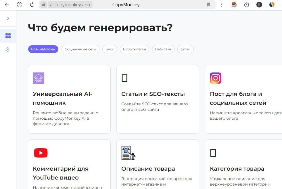 Copy.ai — это еще одна популярная нейросеть, которая помогает создавать маркетинговые тексты. Она предлагает функции для генерации описаний товаров, а также другие типы контента, такие как посты для социальных сетей и рекламные тексты. Copy.ai имеет простой и удобный интерфейс, который позволяет быстро получать результаты.