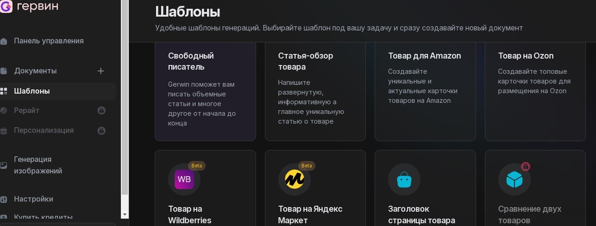 В гервин есть различные шаблоны для генерации описания товаров: статья-обзор товара, товар на Ozon, товар на Wildberries, товар на Яндекс Маркет, заголовок страницы товары, сравнение двух товаров, описание товара, преимущества товара, список характеристик товара.