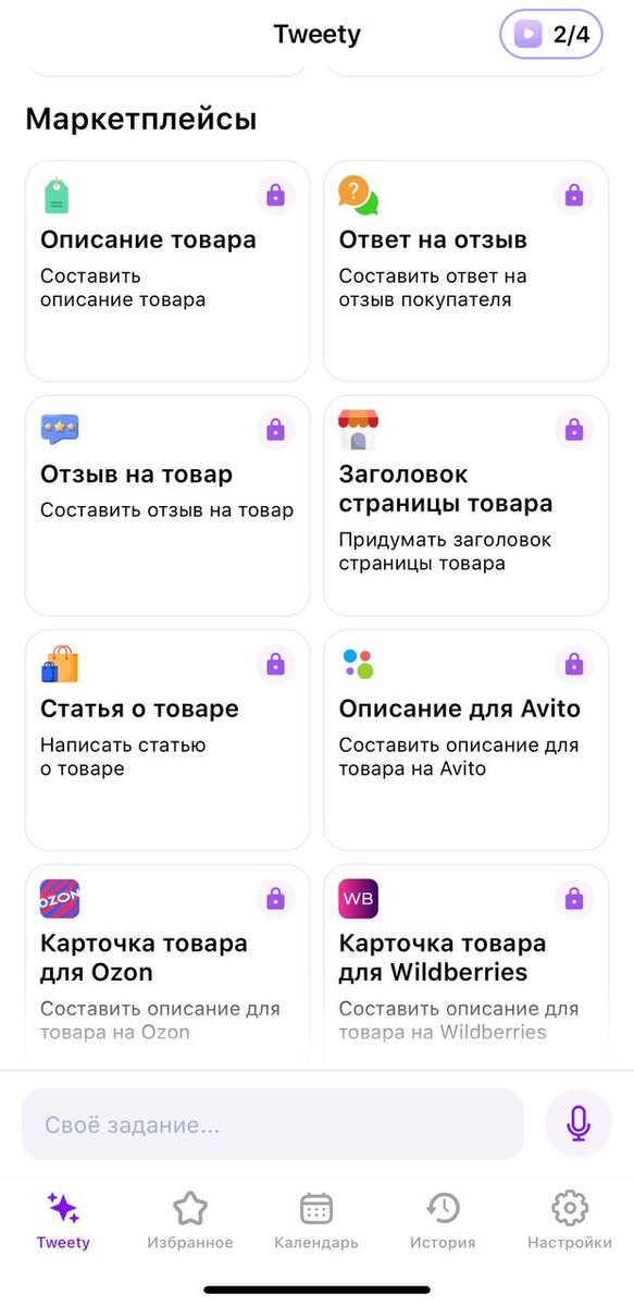 Мобильное приложение с большим количеством шаблонов, в том числе и для создания описаний для товаров. Например, описание для Авито, карточка товара для Ozon, карточка товара Яндекс. Маркет и др.