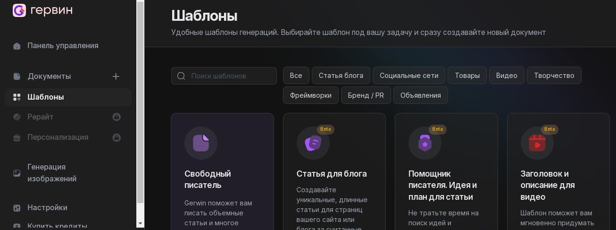 Очень много узкоспециализированных шаблонов под определенные платформы и задачи. Через нейросеть Гервин вы можете сгенерировать разноплановый и интересный контент как для блога, так и для интернет-магазина.