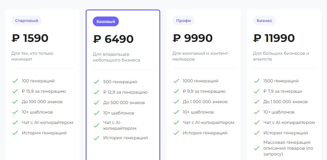 Платная версия стоит от 1590р. При оплате вам становится доступно еще больше шаблонов для генерации текста. Чем дороже тариф, тем больше генераций вы получаете.