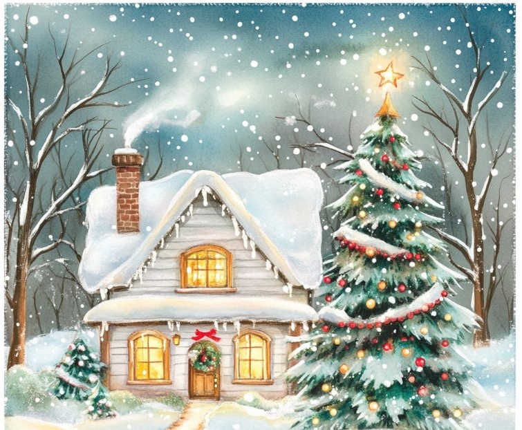 1. «Уютная рождественская открытка в винтажном стиле с изображением заснеженного домика с тёплыми светящимися окнами, рождественской ёлкой внутри, мягким снегопадом, в стиле акварели»