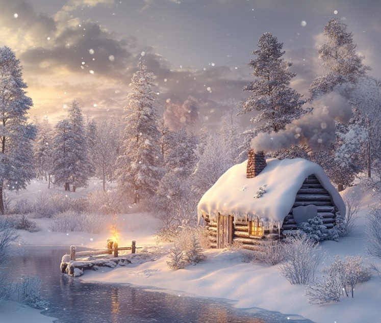 5. «Волшебная зимняя сцена с замёрзшим озером, заснеженными деревьями и маленькой деревянной хижиной с дымом, идущим из трубы, в вечернем свете»
