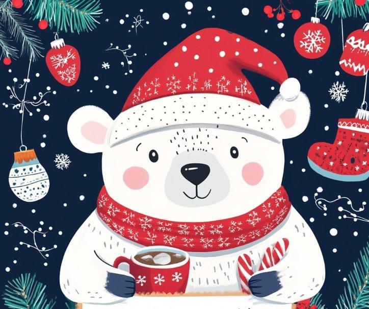7. «Милый белый медведь в красном шарфе и шапке, пьющий горячее какао в окружении рождественских украшений, в стиле кавай»