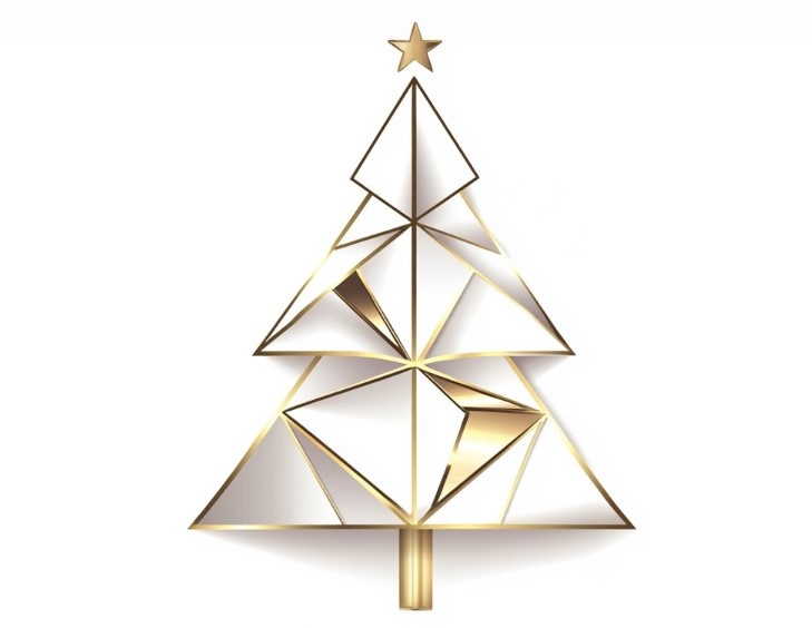 10. «Минималистичный дизайн рождественской открытки с одной геометрической елкой, эффектом золотой фольги, чистым белым фоном»