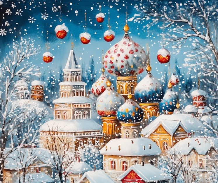 13. «Традиционная русская зимняя сцена с покрытыми снегом луковичными куполами, в стиле народного искусства, с насыщенными цветами и узорами»