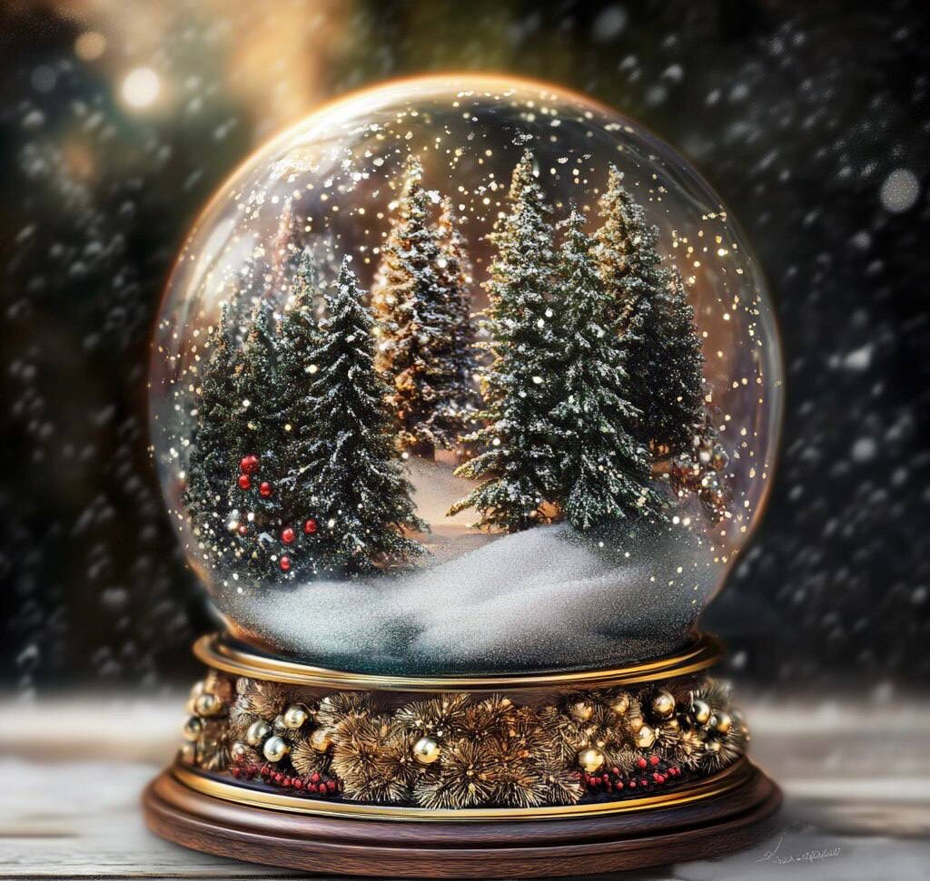 16. «Волшебный рождественский снежный шар с заколдованным лесом внутри, сверкающими эффектами, в стиле фэнтези»