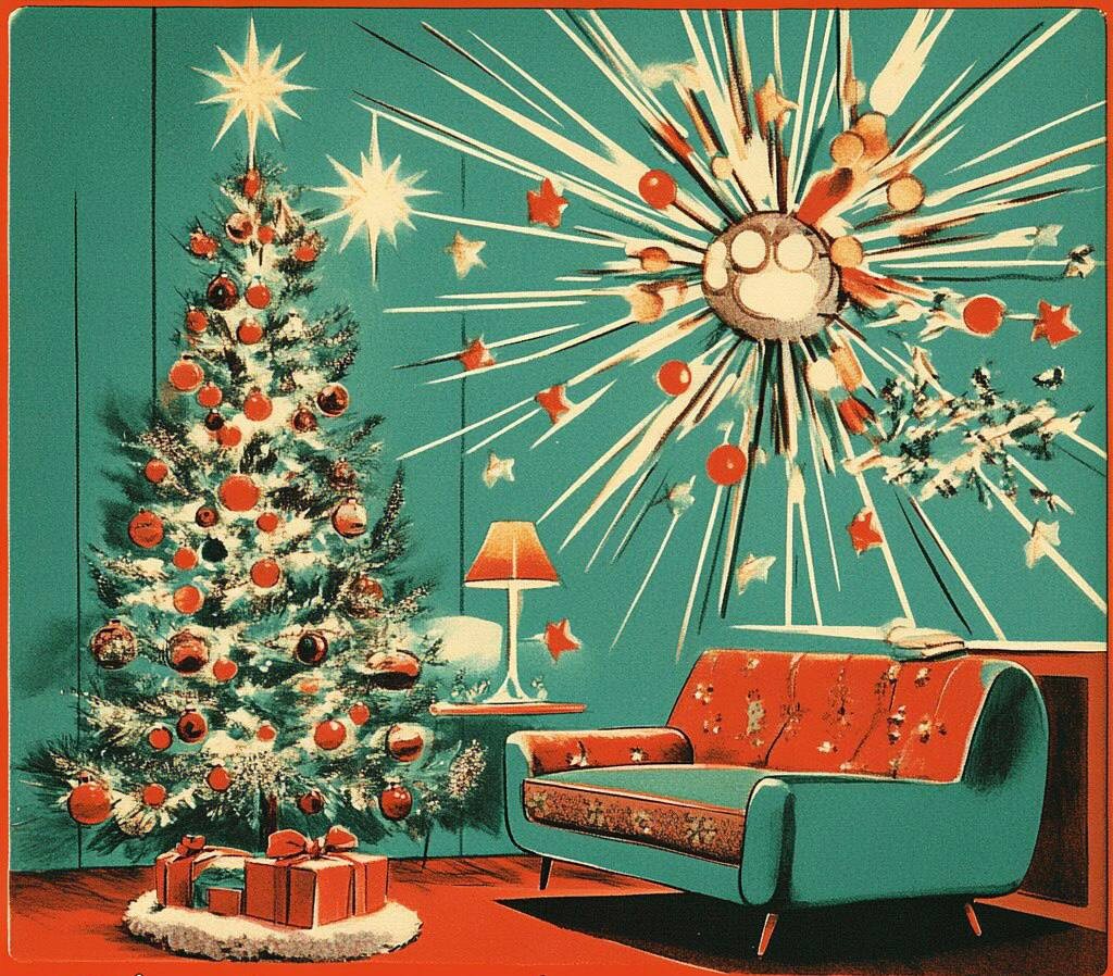 19. «Рождественская открытка в стиле ретро 1950-х годов с элементами дизайна атомного века, винтажной цветовой палитрой, в стиле модерн середины XX века»