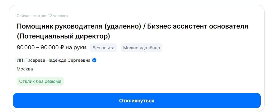 Представь, ты можешь быть таким ассистентом! Ты помогаешь другим строить бизнес, свободна от офисной суеты и можешь работать из любой точки мира! Работая с предпринимателем, ты поймешь, как всё устроено изнутри в бизнесе. И тебе захочется попробовать свои силы, открыть свой собственный бизнес. Кто знает, может, так и произойдет! 🚀