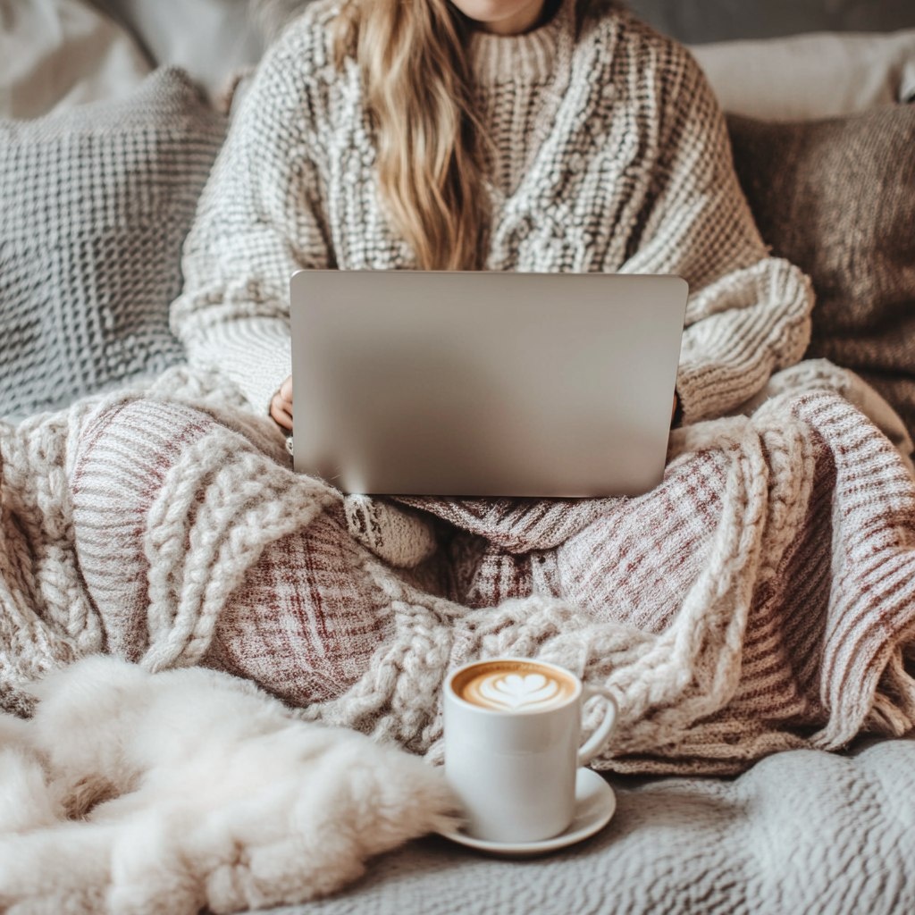 Пример промпта: «Девушка за ноутбуком в стиле скандинавского уюта: светлое дерево, плед, чашка кофе с паром, пастельные тона».