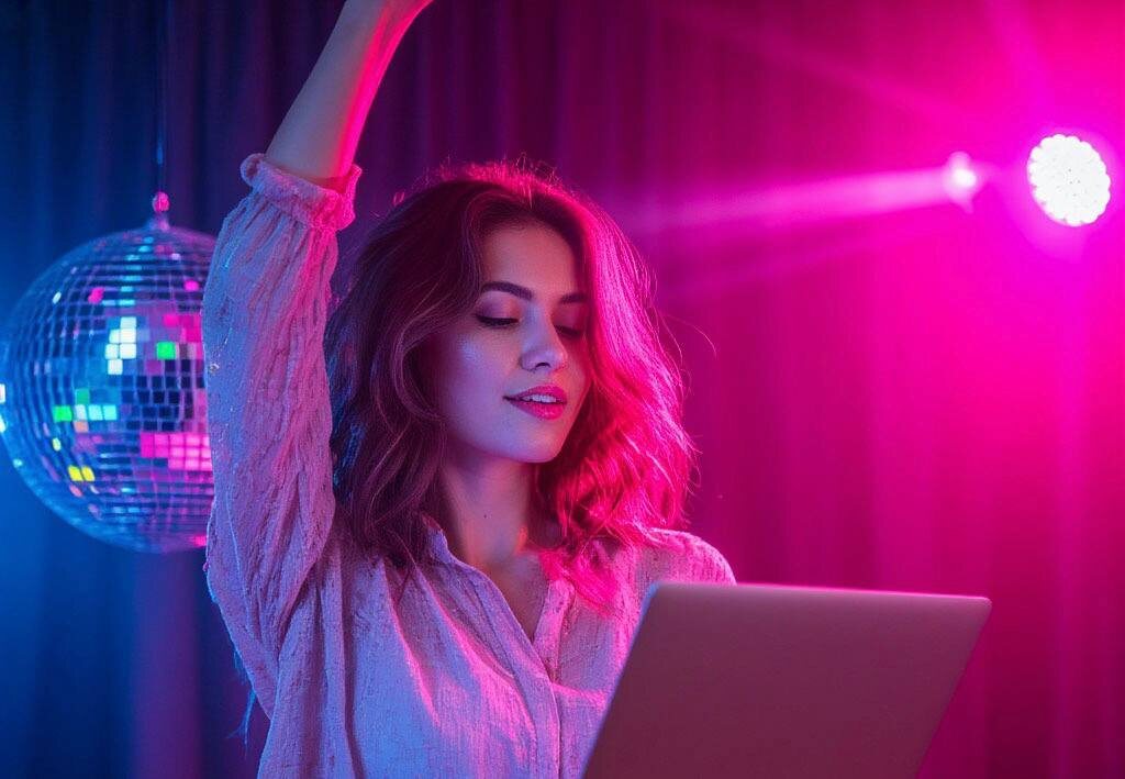 Пример: "Женщина танцует с ноутбуком в руках: разноцветные блики от диско-шара, розовый и голубой свет, динамичное размытие фона. Энергия и свобода!"