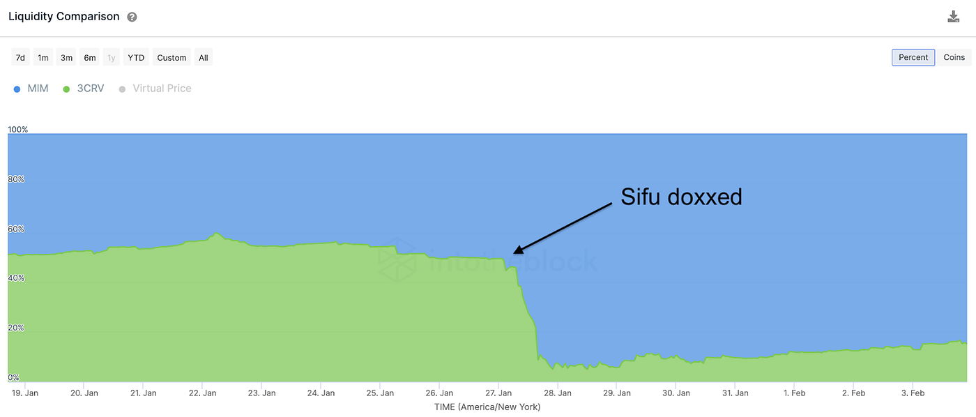 В течении нескольких часов из пула было выведено около 2 миллиардов долларов ликвидности. Поскольку пул состоял из MIM и 3Crv (другой пул, в котором 33,3% USDT, USDC, DAI), вкладчики предпочли вывести средства в 3Crv, чтобы избежать рисков, связанных с MIM. Это привело к тому, что состав активов в пуле стал несбалансированным.