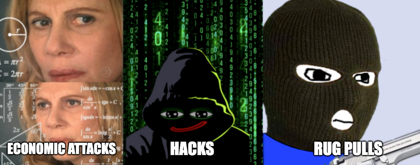 В этом контексте мы бы классифицировали взломы как чисто технические, внешние атаки, рагпуллы как внутренние, преднамеренное злоупотребление техническими факторами и экономические эксплойты как те, которые используют преимущества дисбаланса экономических протоколов.