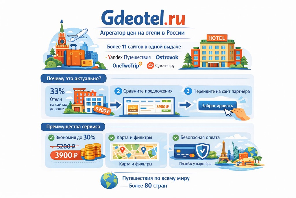 В России начал работу Gdeotel.ru — агрегатор цен на отели, который собирает предложения разных площадок в одной выдаче и помогает сравнить варианты по цене и условиям. По данным проекта, сервис показывает предложения более чем с 11 сайтов, включая Яндекс Путешествия, Ostrovok.ru, OneTwoTrip и Суточно.ру.