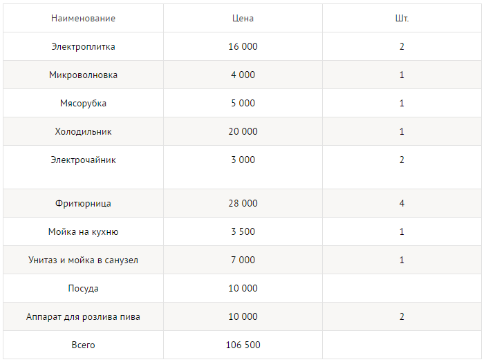 Для хорошего предложения ассортимента блюд необходимо организовать небольшую кухню. Для этого потребуются вложения в оборудование: