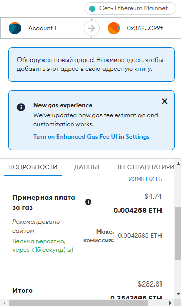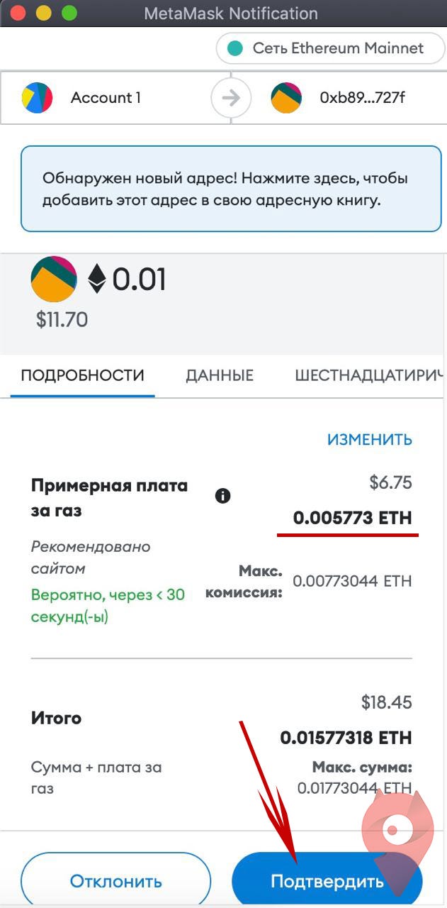 Шаг 3 — подтверждаем в Metamask транзакцию. Обратите внимание, что комиссия за газ составляет 0,006 ETH.