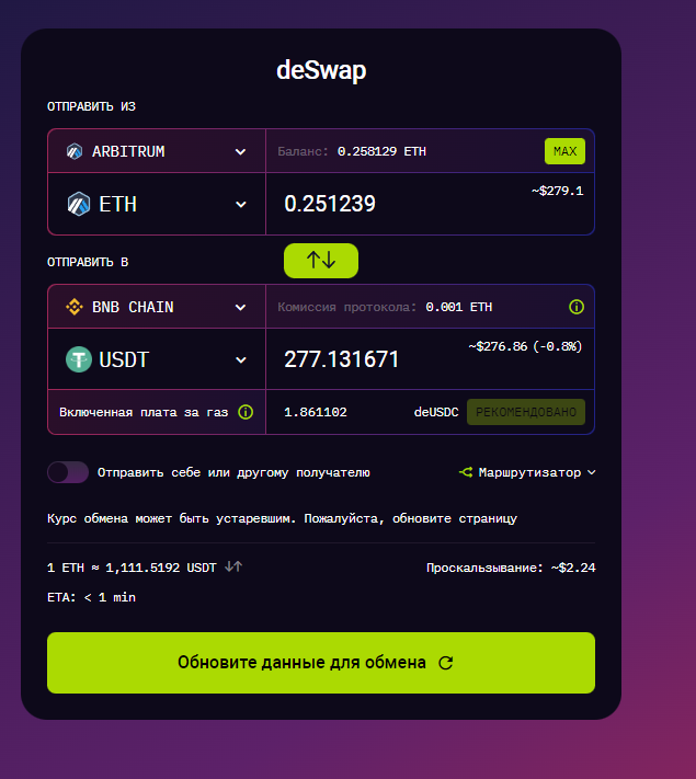 Теперь мы переводим ETH из сети Arbitrum в любую удобную для вас сеть. Можно выбрать BSC (Там минимальная комса)