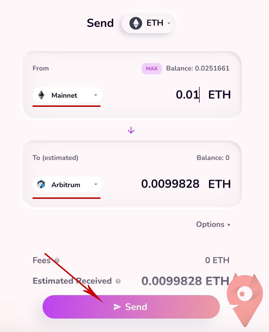 Шаг 2 — Выбираем сеть, с которой отправляем Mainnet и куда — сеть Arbitrum. И жмем кнопку Send.
