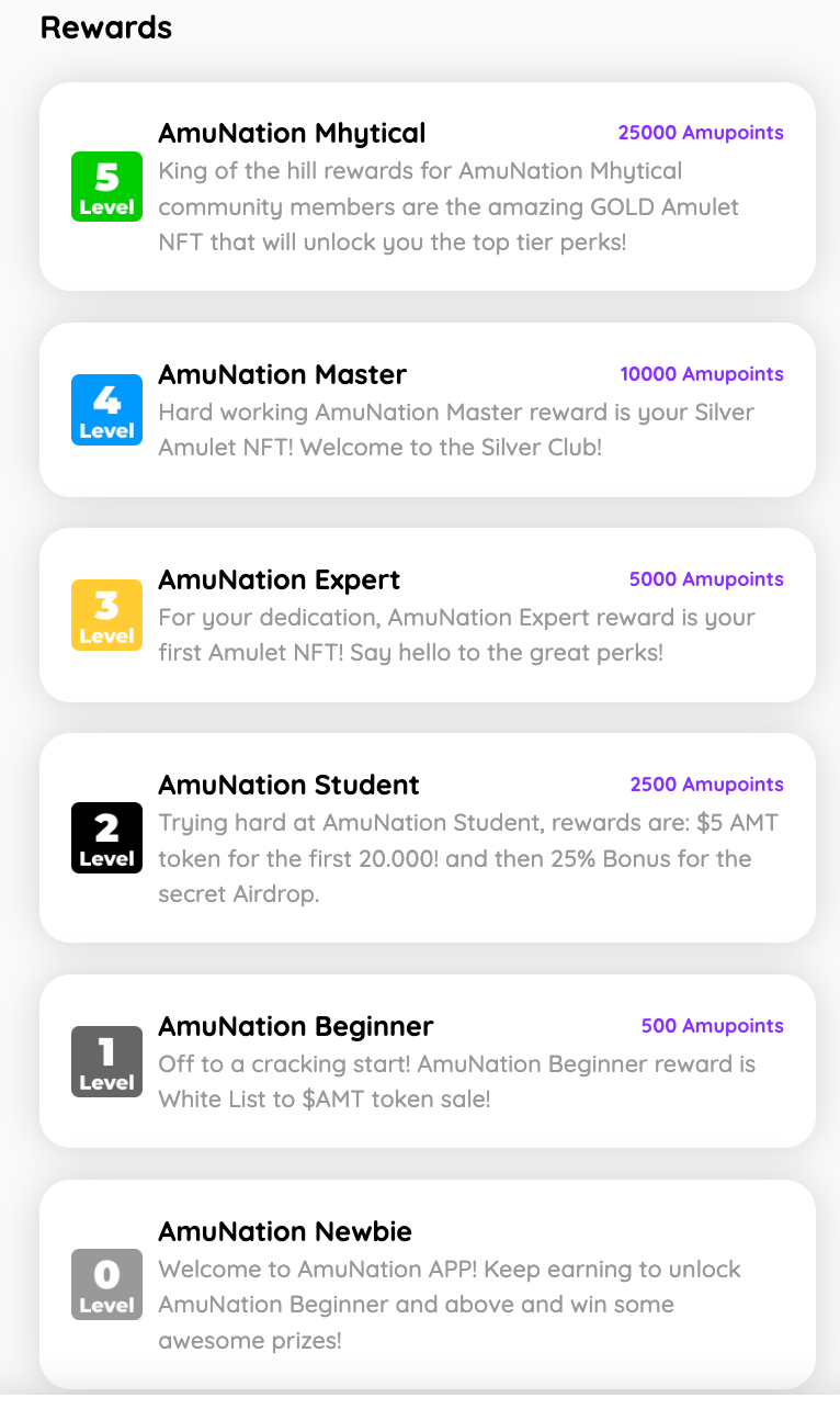 - AmuNation Master (4 уровень 10000 поинтов) — награда серебрянный Amulet NFT.