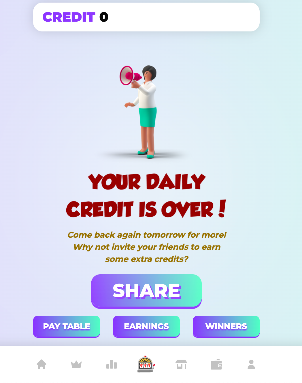 Следующий пункт — джекпот. Здесь испытываем свою удачу, всего у нас 3 прокрутки в сутки, описание выигрышных комбинаций находится по кнопке PAY TABLE.