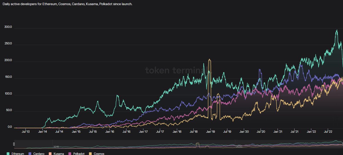 Разработчики представляют собой основу любой экосистемы. Хотя рост или снижение числа разработчиков ничего не говорит о качестве приложений, вы хотите видеть рост именно там.